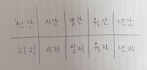 천간은 8글자 중에 위쪽에 자리한 4글자를 말하고, 지지는 8글자 중에 아래쪽에 자리한 4글자를 말하는 것이었다.