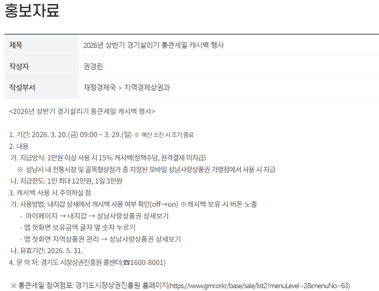 | 경기살리기 통큰세일 - 성남지역화폐 결제시 15% 페이백 (0) | 2026.03.20 |