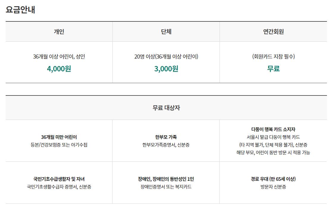 서울 상상나라 역시 부담 없는 금액이며, 36개월 미만 아동 무료이면서