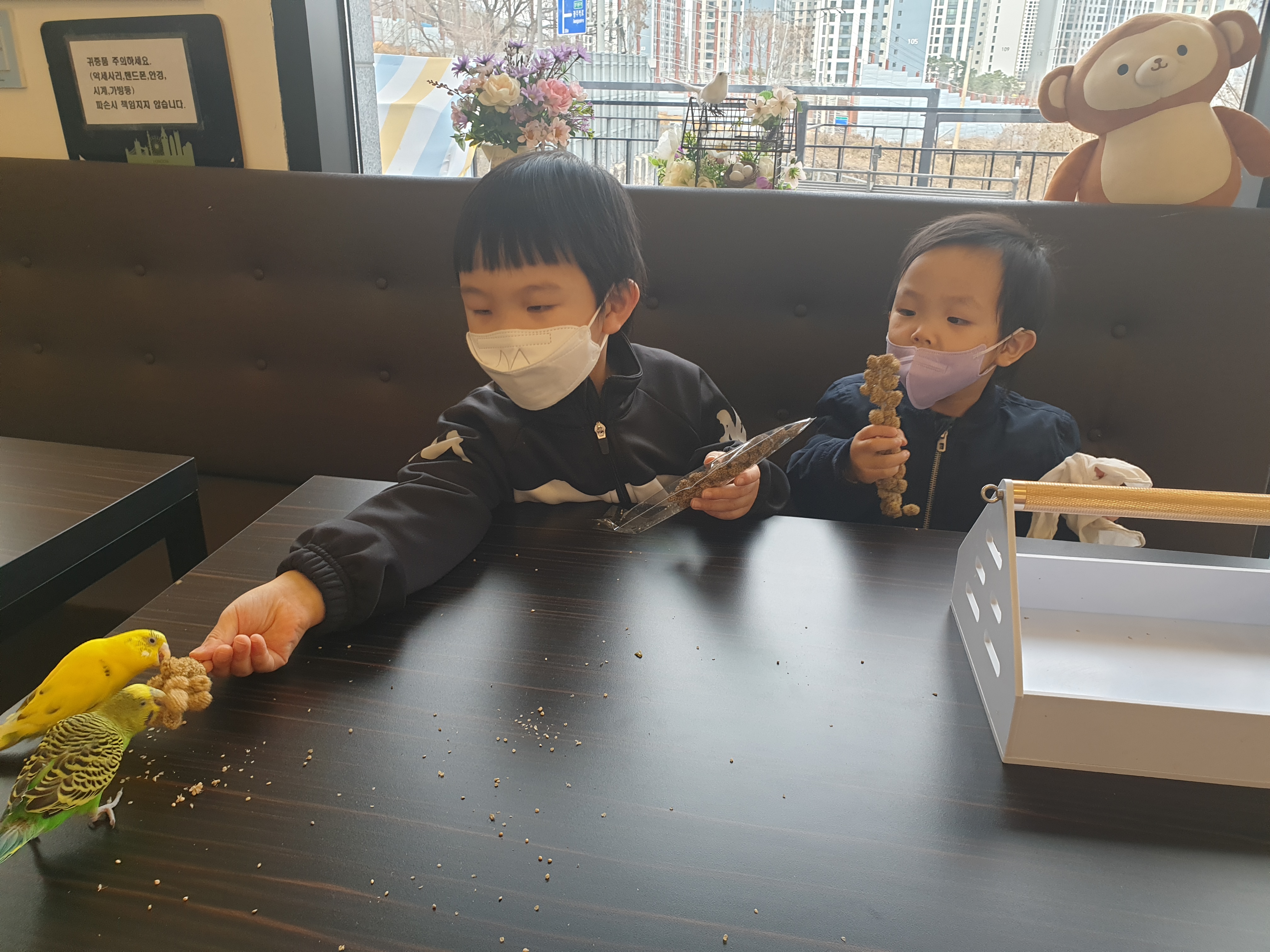 너무 웃겼답니다. ㅎㅎㅎ 이 날 평일이고, 어린이들 하원 시간 보다 조금 이른 시간이어서 그런지 저희 포함 2팀밖에 없었습니다. 그래서 그런지 앵무새들끼리 간식 차지가 치열했습니다.