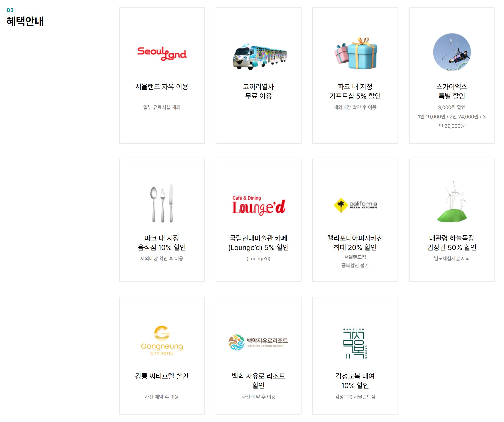 *서울랜드 연간권을 이용해 본적은 없지만 파크 내 지정 음식점 10% 할인/ 파크 내 지정 기프트샵 5% 할인이 마음에 든다.