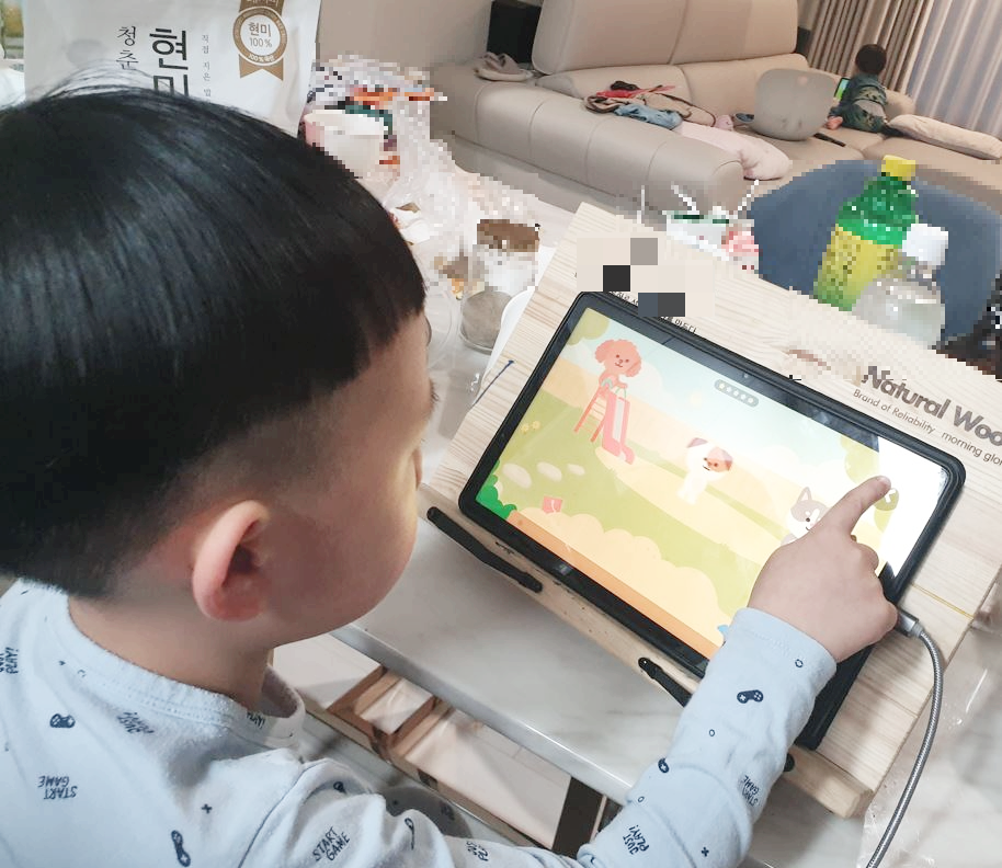 같은 아이디로 한넘은 식탁에서 한넘은 쇼파에서 각자 나이에 맞는 문제를 풀고 있습니다.