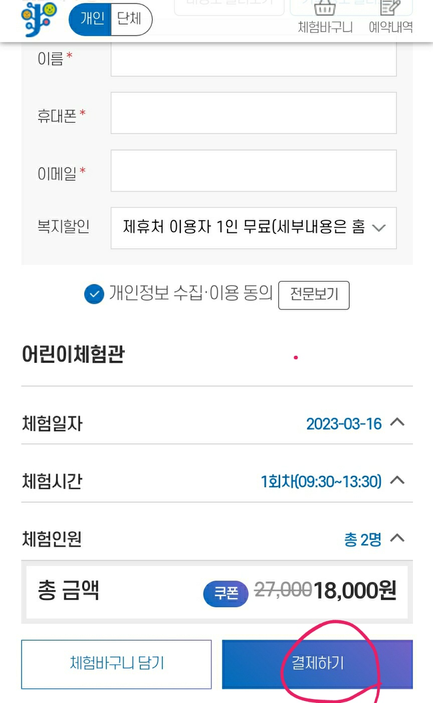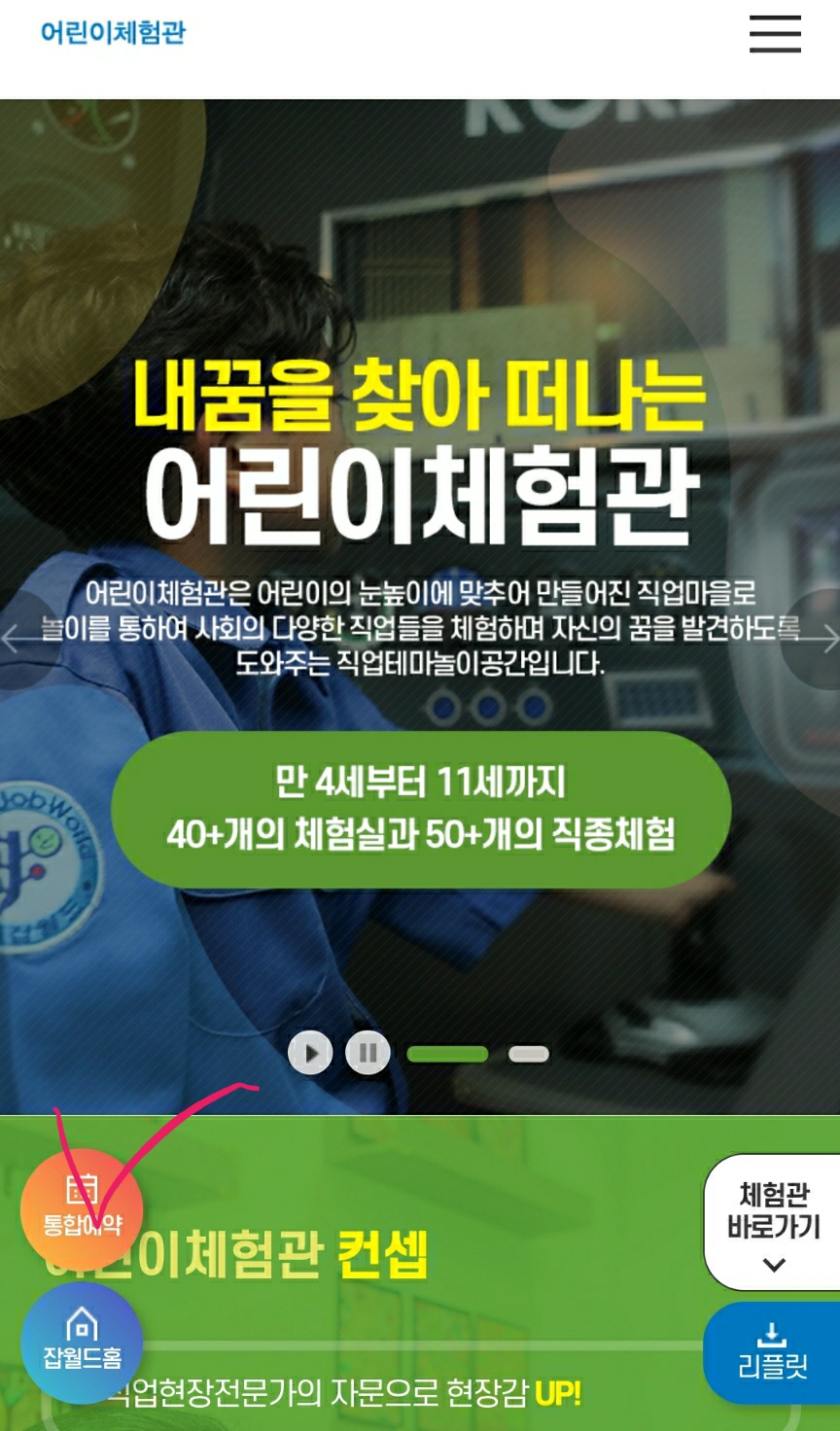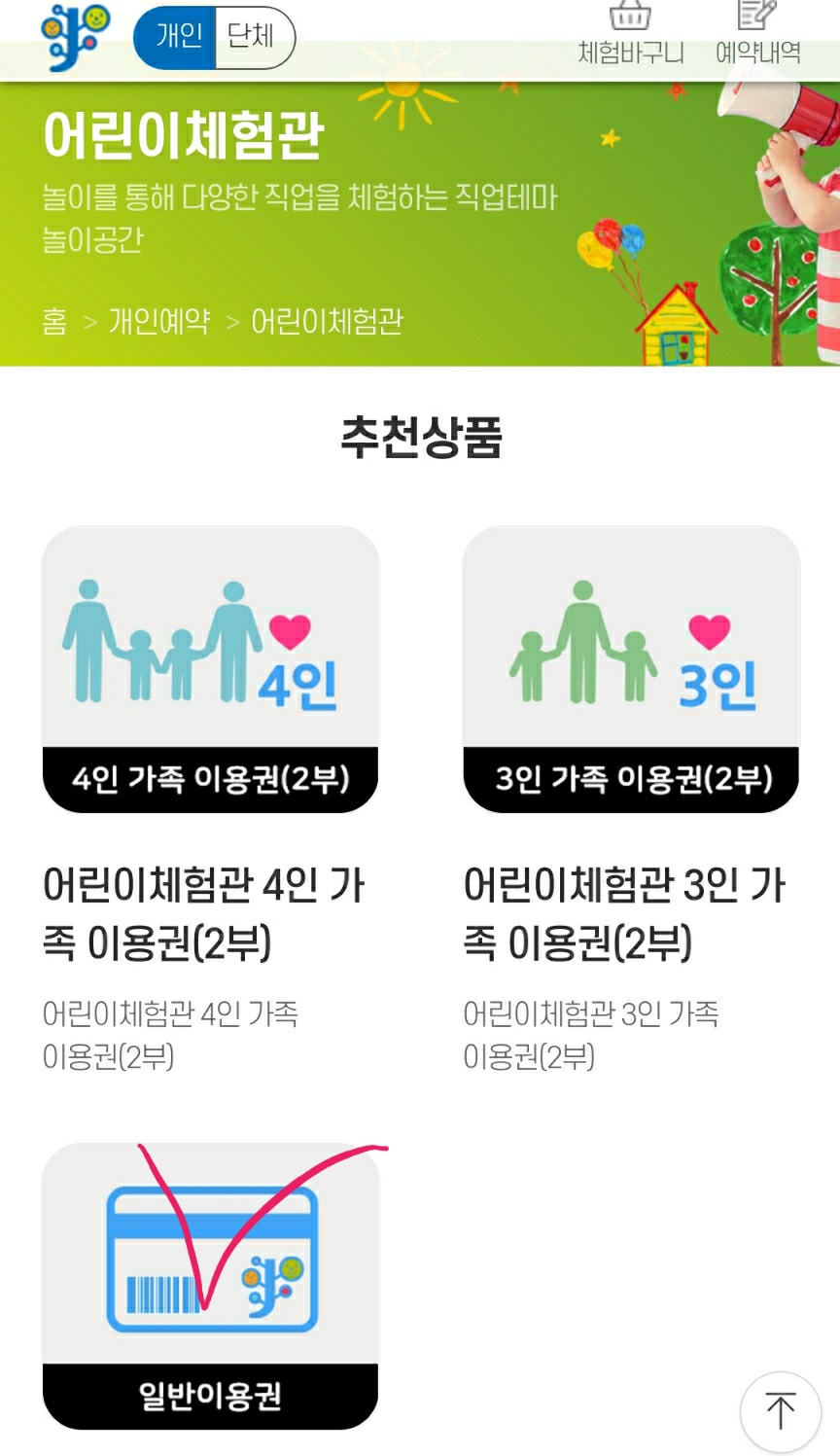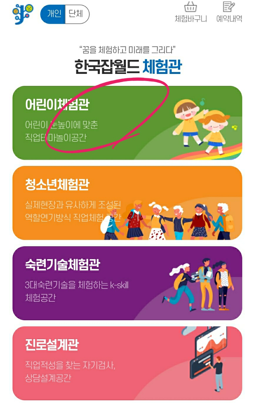 어린이 체험을 예약할 것이기 때문에 어린이체험관을 클릭합니다.