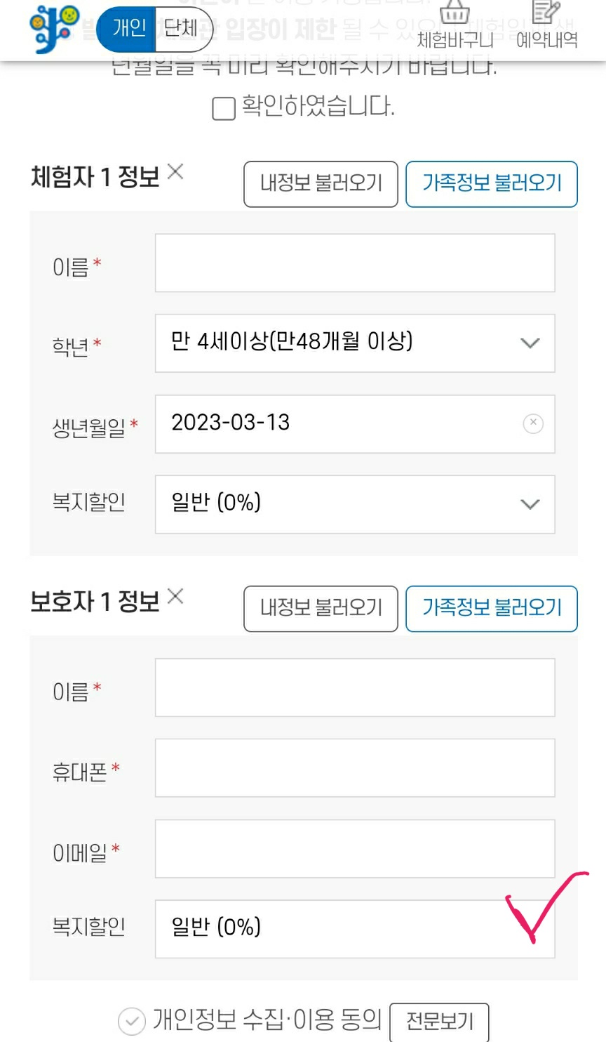 보호자 1 정보 입력란에 복지할인을 클릭합니다.