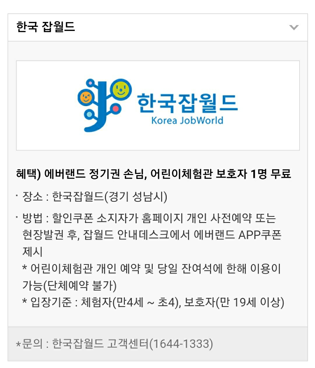 이렇게 에버랜드 어플을 켜고 쿠폰 함에 들어가면 한국 잡월드 제휴 쿠폰이 들어있는 것을 볼 수 있습니다.
