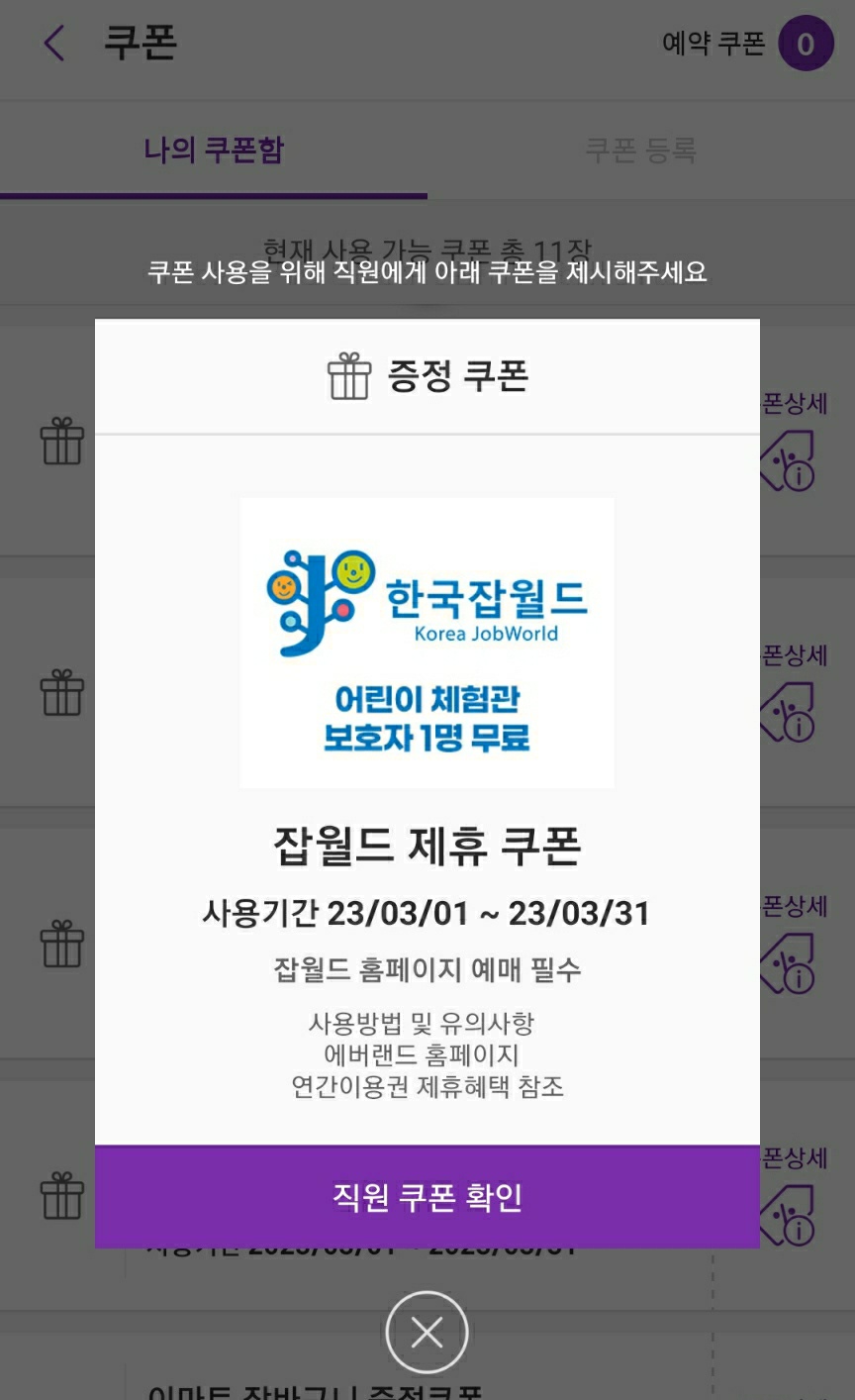 2월에 쿠폰을 사용하지 않아서 그런지 3월 에버랜드 정기권 쿠폰 함에 한국잡월드 할인쿠폰이 또 떠 있었습니다.