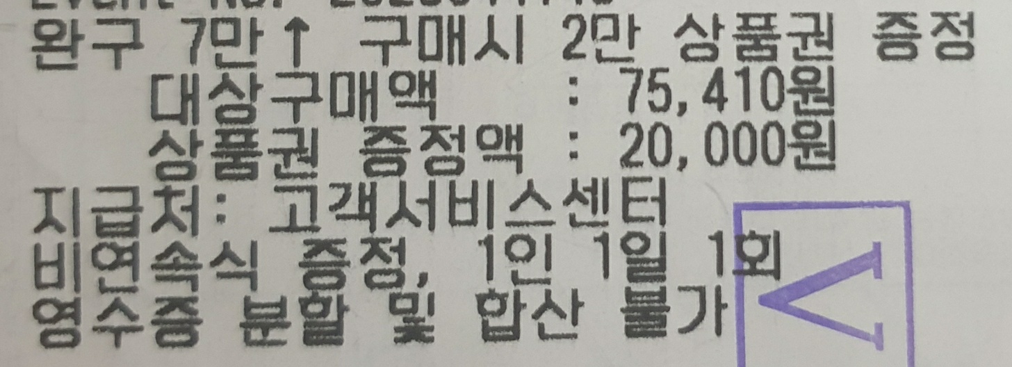 "2만원 드리는 행사는 오늘(26일) 까지고, 내일부터는 10만원 이상 2만원/ 7만원 이상 1만원 상품권 지급이랍니다^^"