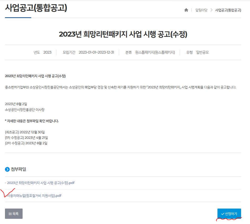 이런 화면이 떴는데 나에게 가장 중요한 / 희망리턴패키지를 신청하게된 계기이기도 한 점포철거비 지원사업 첨부파일이 있길래 한번 다운받아 읽어보고, 저장해놓고, 오른쪽 하단에 신청하기 버튼을 클릭했습니다.