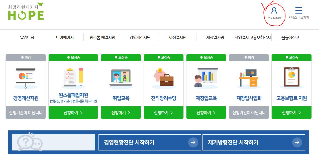 ㅡ> 마이페이지 ㅡ> 사업정리 컨설팅칸에 상호누르기