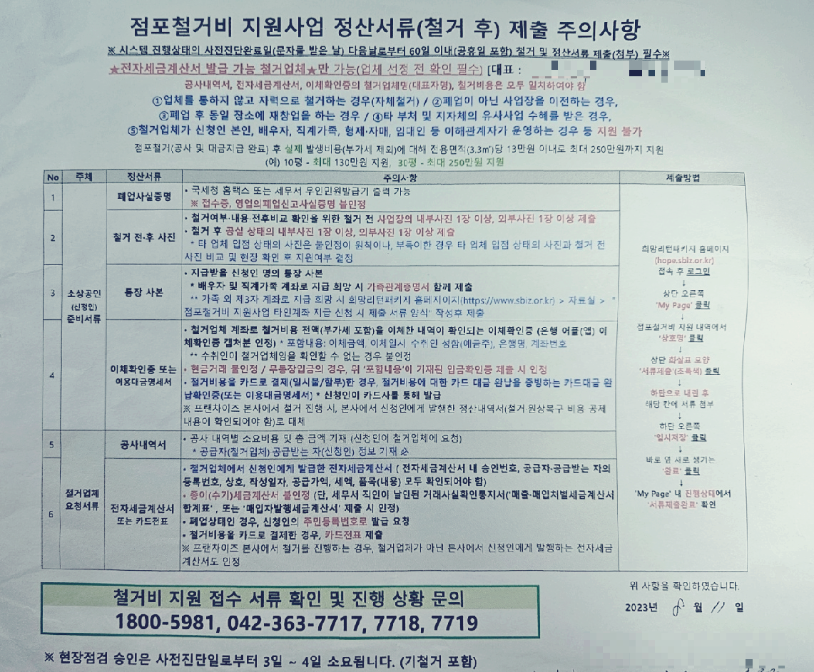 담당자분께서 현장상태를 확인하시고, 점포철거비 지원사업 정산서류(철거 후) 제출 해야하는 서류 주의사항 프린터를 주고 가십니다. (아랫쪽에 프린트사진 올리겠음)