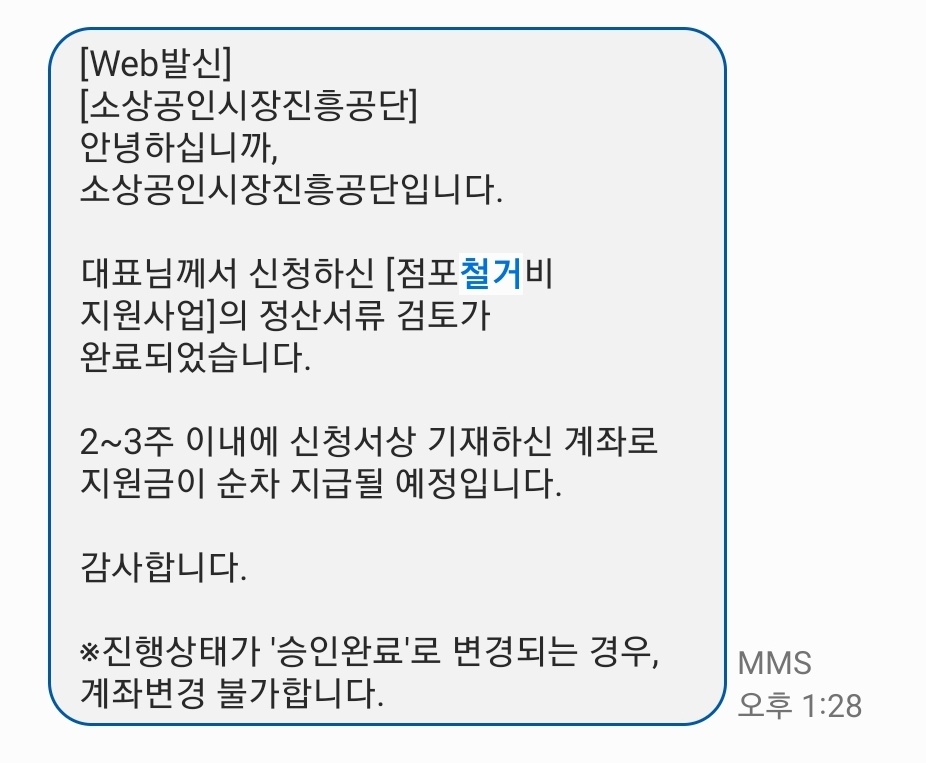그렇게 모든 과정을 끝내고 기다리니 소상공인진흥공단에서 승인문자가옵니다.