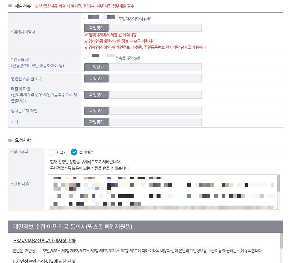 신청서에 인적사항을 적고, 필요한 제출서류(필수:1.임대차계약서, 2.건축물대장)를 올립니다.